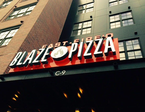 Blaze is essentially a Neopolitan pizza place married to a Chipotle. The pizzas, developed by chef Bradford Kent of Olio Pizzeria & Café in Los Angeles, are also remarkably consistent: crisp from center-to-edge, with toppings applied sparingly, as they should be.
