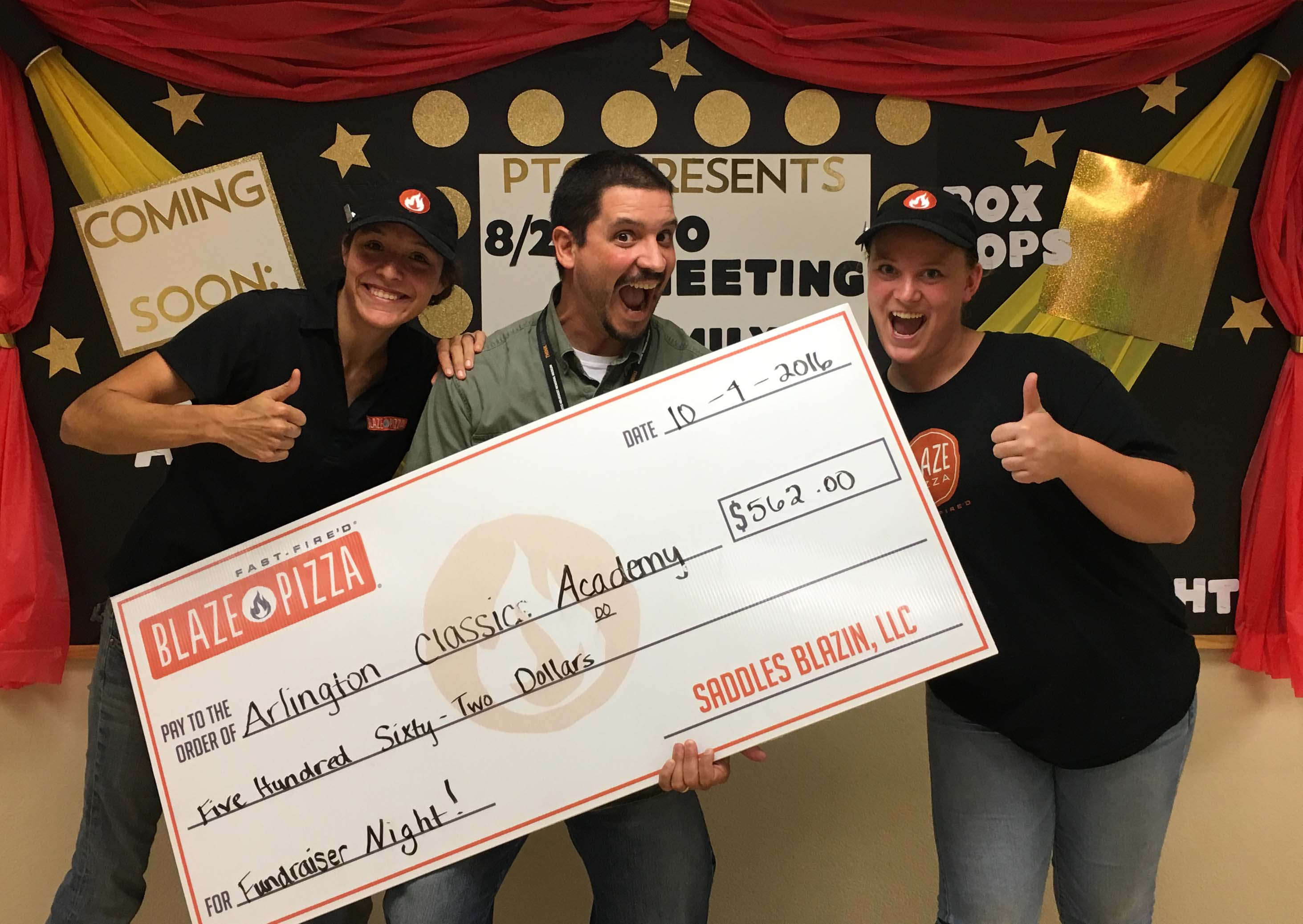 Blaze Pizza in Arlington hosted a fundraising event for Arlington Classics Academy Fundraiser. Blaze donated 20% of the proceeds from the meals of patrons who showed the fundraiser flyer and/or wore the fundraiser sticker.